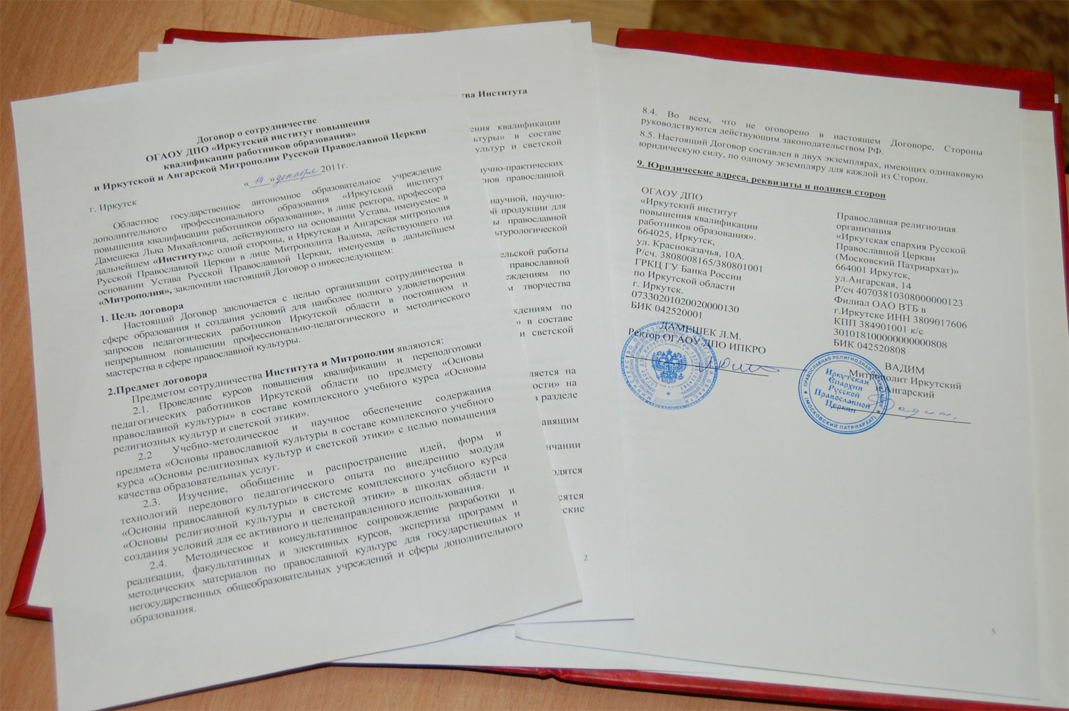 4 декабря в Иркутском институте повышения квалификации работников образования митрополит Иркутский и Ангарский Вадим подписал особо значимые для развития духовно-нравственного просвещения и культуры в области документы, — Соглашение между Министерством образования и науки Иркутской области и Иркутской Митрополией Русской Православной Церкви в сфере образования и духовно-нравственного воспитания детей и молодежи, а также Договор о сотрудничестве ИИПКРО и Иркутской и Ангарской митрополии Русской Православной Церкви.